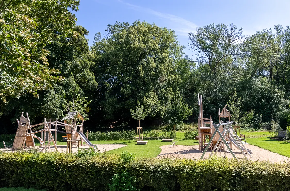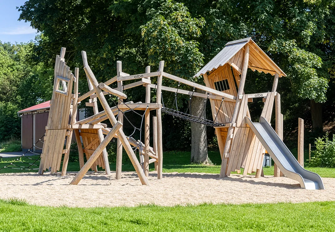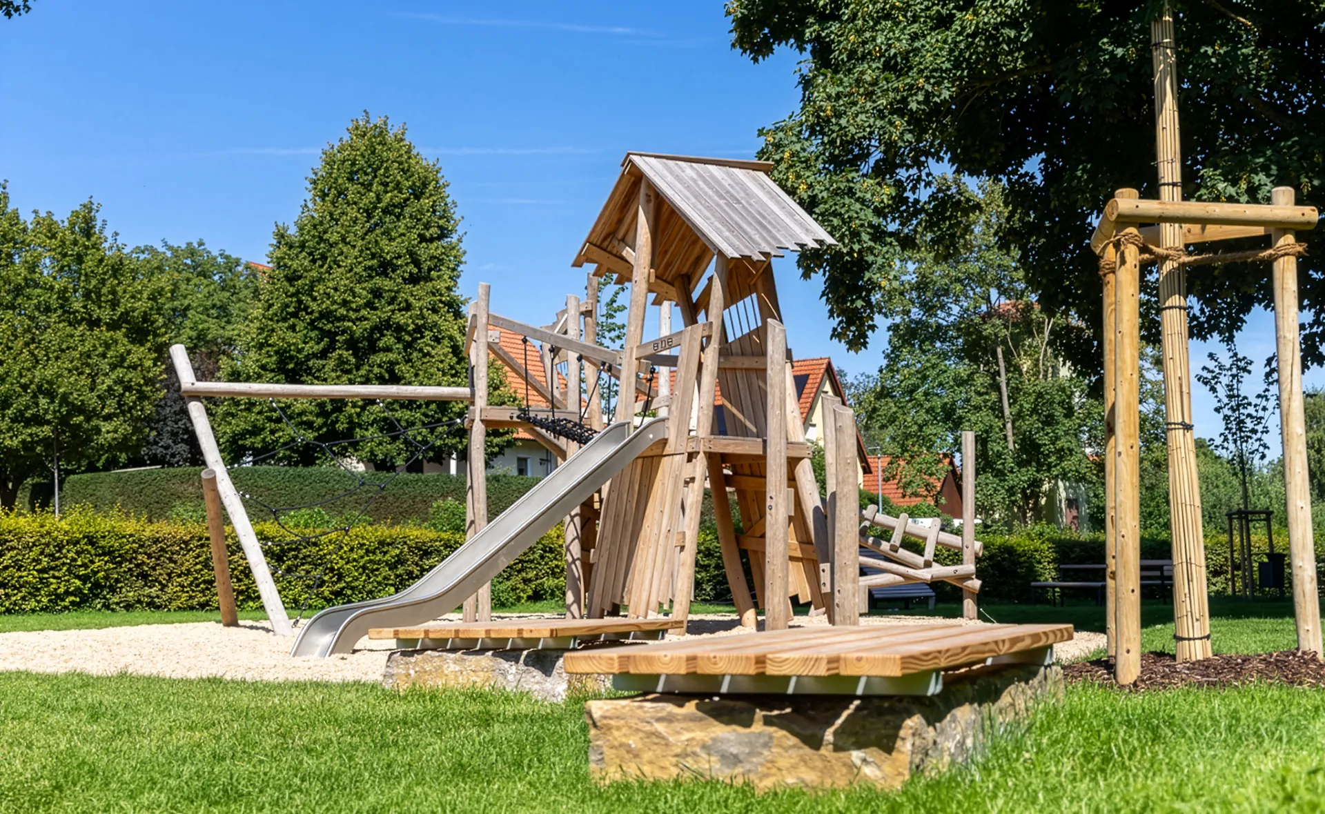 Der Naturspielplatz verbindet naturnahe Gestaltung mit langlebigen Holz- und Spielelementen. Großzügige Grünflächen und robuste Materialien schaffen einen sicheren und zugleich erlebnisreichen Raum für Kinder.
